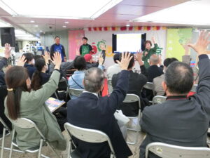 座席は満席で、立ち見のお客様もいらっしゃる程でした。皆さん、熱心に講演内容に耳を傾け、最後のクイズにも楽しくご参加いただきました。正解者にはコアレックスの再生紙トイレットペーパーをプレゼントしました。