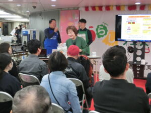 「大阪・関西万博での紙資源循環」をテーマに、元気ネットの鬼沢良子、コアレックス信栄(株)の杠茂樹・栄羽英範によるトークショーを行い、
