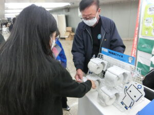 トイレットペーパーの手触りテストに挑戦し、参加賞としてコアレックスの再生紙トイレットペーパーをプレゼントしました。